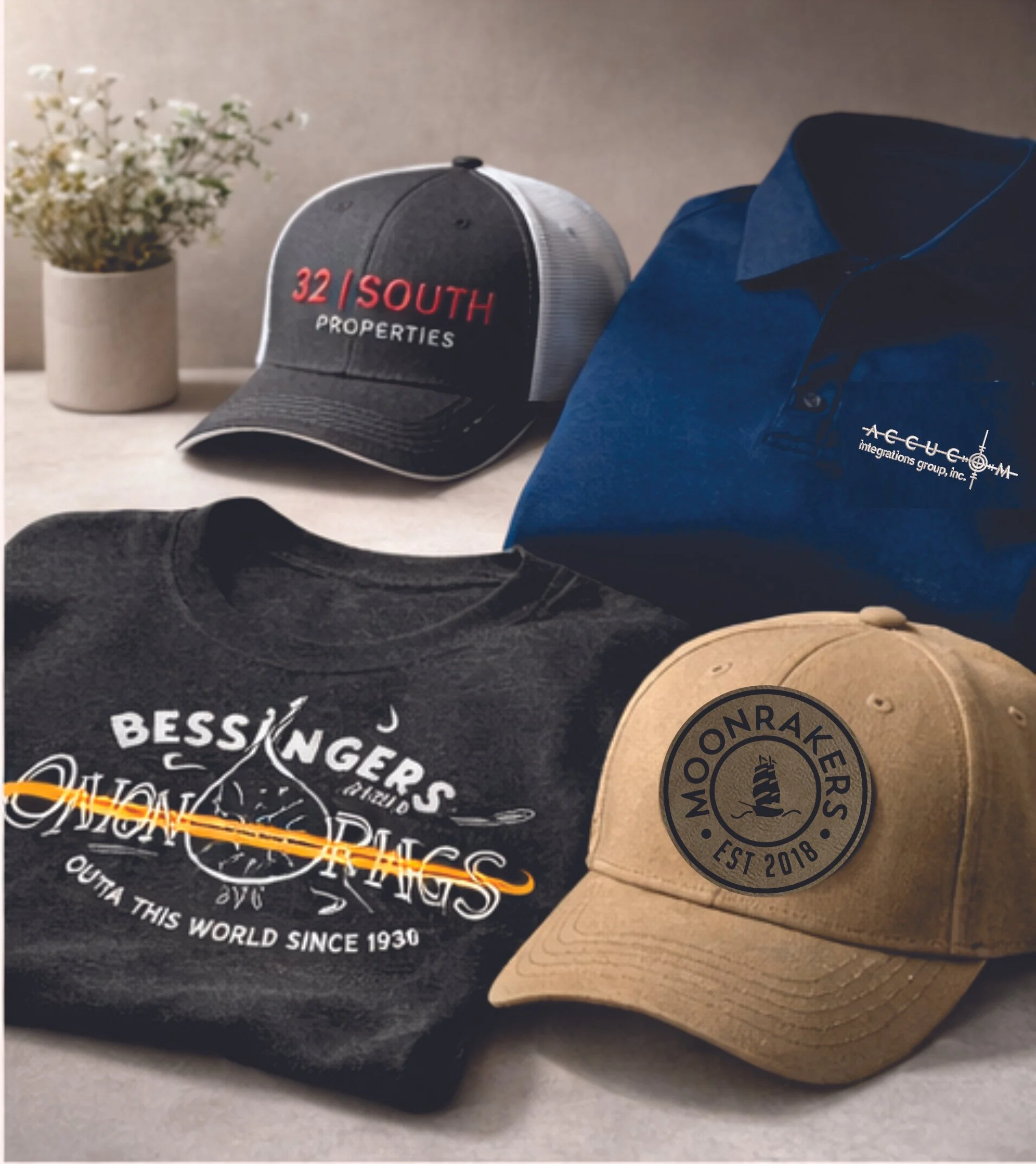 Custom polos, t-shirts, hoodies, hats, and workwear with embroidery or screen printing.